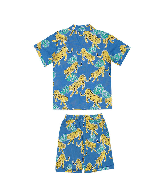 Kidilisious Pure Linen Blue Cheetah Coord Set: Shorts and Shirt Ensemble