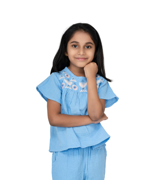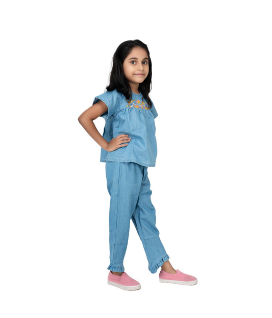Kidilisious Denim Coord Set With Embroidery For Girls